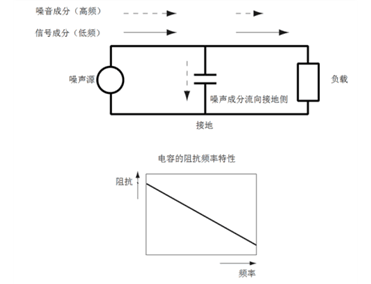 低通濾波器如果要利用該特性,就需要將電容插入噪聲通道與地線之間。如此一來,低頻信號(hào)能夠照常通過,高頻噪聲成分因接地側(cè)的阻抗較低,將流向接地側(cè),從而達(dá)到降噪效果。