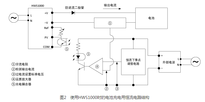 另一種控制恒流的方法是將外部電路連接到電源上,而不是像前面解釋的那樣通過(guò)過(guò)流保護(hù)轉(zhuǎn)移電流。以TDK的HWS1000為例來(lái)解釋這個(gè)過(guò)程:并聯(lián)電阻應(yīng)用在電源的負(fù)載線上,輸出電流的電壓轉(zhuǎn)換是通過(guò)并聯(lián)電阻實(shí)現(xiàn)的,并進(jìn)行輸出電流檢測(cè)。設(shè)計(jì)了恒流下垂點(diǎn)的調(diào)節(jié)電路,并建立了過(guò)流的標(biāo)準(zhǔn)電壓。在運(yùn)算放大器中比較(2)和(3)的電壓,在光耦合器中控制電源的輸出電壓。